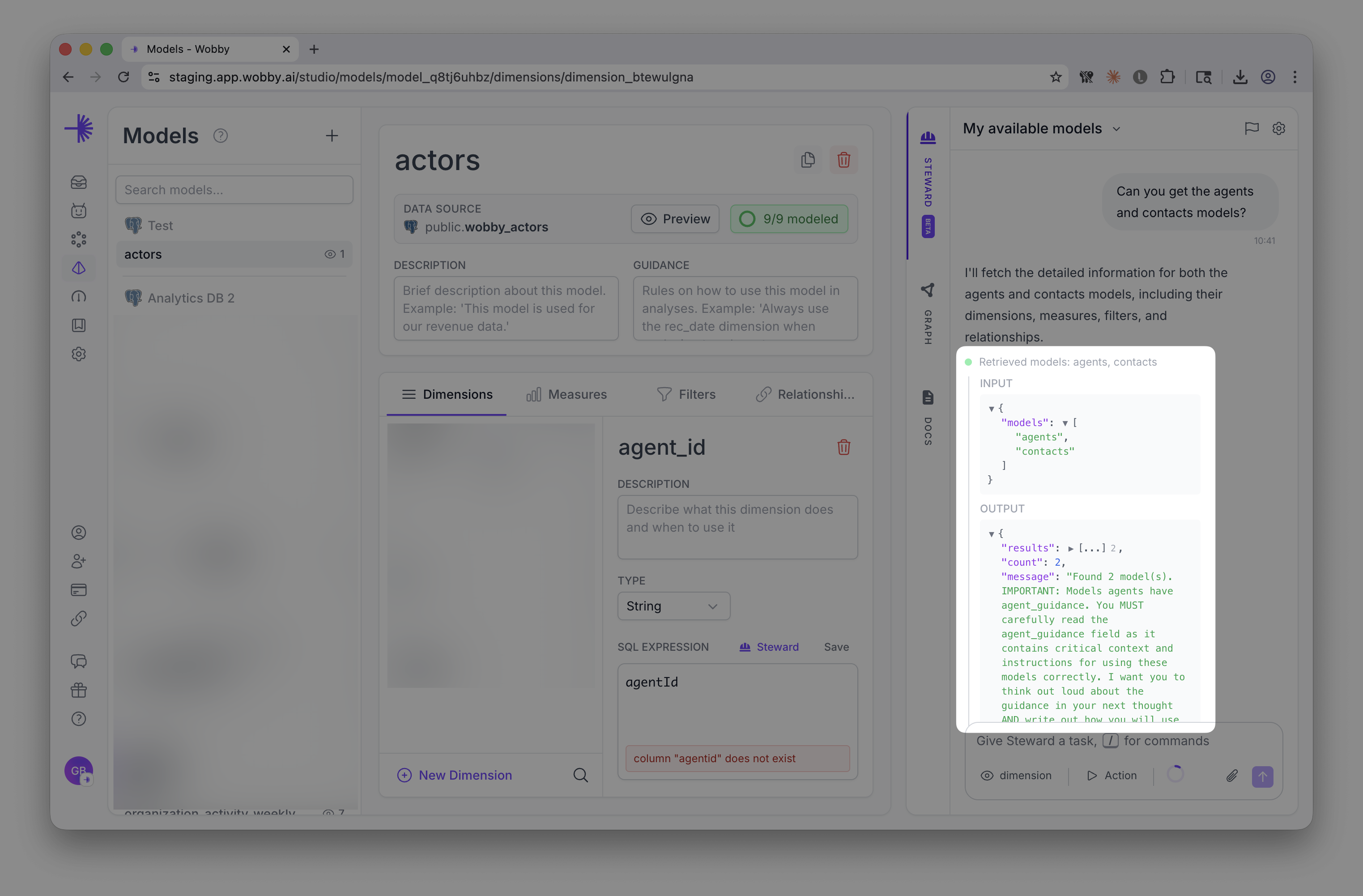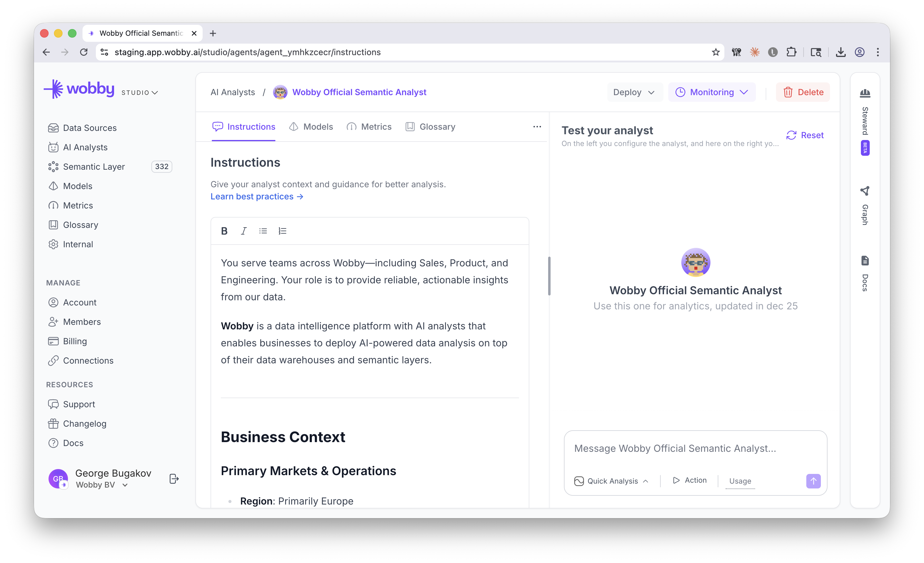 Every time you (or Steward) make an edit to your semantic layer or agent configuration, Wobby takes a snapshot. You can easily view the list of snapshots, and easily roll back changes by reverting to an earlier snapshot. Pretty handy! -
